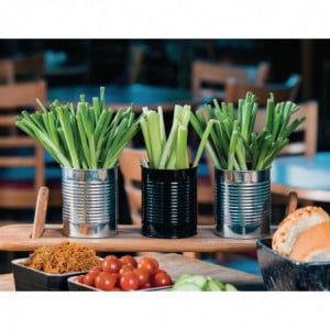 This can-shaped container allows for a unique and innovative presentation of foods such as fries and small appetizers. Made of galvanized steel with a shiny finish, it does not rust when washed.