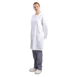This White Unisex Blouse with long sleeves is size XL. Ideal for healthcare professionals, it will offer you comfort and durability. It features a button closure.