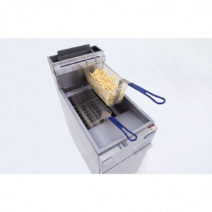 This Professional Fryer has a 21 L tank. It is equipped with 2 baskets of L 165 x D 335 x H 150 mm. You can control the temperature from 93 °C to 205 °C. This fryer is equipped with automatic safety by thermocouple and thermopile.