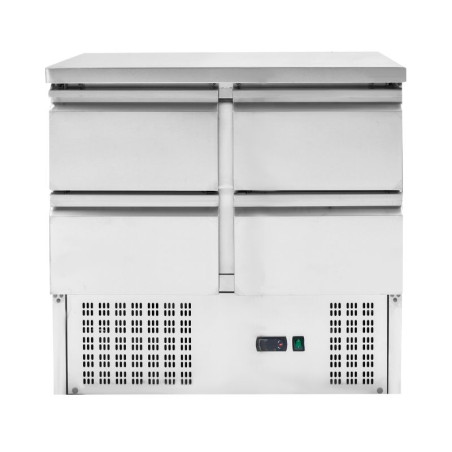 This table is equipped with four spacious GN 1/2 type drawers, each of which can be used to store various types of ingredients separately, thus facilitating organization and quick access to necessary products. The temperature range, from 2°C to 8°C, keeps food at an ideal temperature, thus ensuring their freshness and quality. Additionally, the static cooling system ensures even temperature distribution without drying out the stored products.