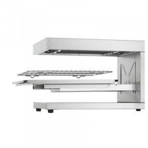 The two long open sides allow practical use on both sides in the kitchen or in the service. With an adjustable height grid, it measures L 430 x D 300 mm and a radiant heating source.