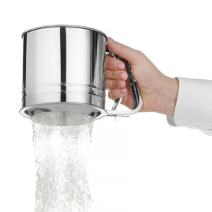 One of the remarkable features of this sieve is its spring mechanism with a pressure handle that allows for effortless use. No more hassle when sifting large quantities of flour; thanks to this mechanism, preparing doughs and pastries becomes a simple and quick task. Moreover, the two layers of very fine mesh ensure a homogeneous and lump-free texture for all your dry ingredients.