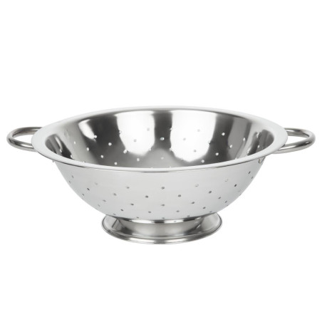 Drain all kinds of ingredients quickly and easily with this Vogue strainer. Featuring two sturdy handles for easy gripping and handling. The numerous holes make it the perfect utensil for draining pasta, rice, and vegetables effortlessly and reducing your preparation time. Made of stainless steel, the strainer is extremely robust and durable, allowing it to withstand rigorous use in professional kitchens.