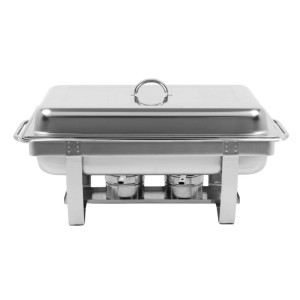 Livré avec un couvercle, un bac GN 1/1, un support pour combustible et deux boîtes à combustible par chafing dish.