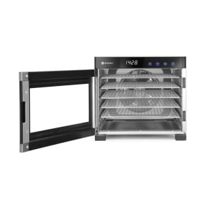 Ce Déshydrateur de la gamme PROFI LINE de chez Hendi 6 plateaux pour assécher fruits, légumes, herbes, viandes, poissons... Il est équipé de 6 plateaux en inox de 327 x 330 mm. Température réglable de 35 ° à 70 °C par étapes de 5 °C.
