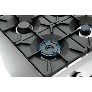 Le fourneau en acier inoxydable 18/10 dispose de 6 feux vifs (1 x 3,5 kW, 2 x 5 kW, 3 x 8 kW) à gaz équipés de veilleuses et brûleurs à gaz à double couronne.