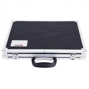 Idéal pour les professionnels de la restauration, cette Mallette à Couteaux Magnétique 6 fentes est une mallette à couteaux magnétique robuste permettant de transporter les couteaux en toute sécurité. Peut contenir 6 couteaux ou ustensiles. Elle est dotée d'une poignée robuste et de deux fermetures à charnière en métal (fournies vides). Ses dimensions sont les suivantes : L 430 x P 320 x H 60 mm. Il permet de protéger les lames de vos couteaux.