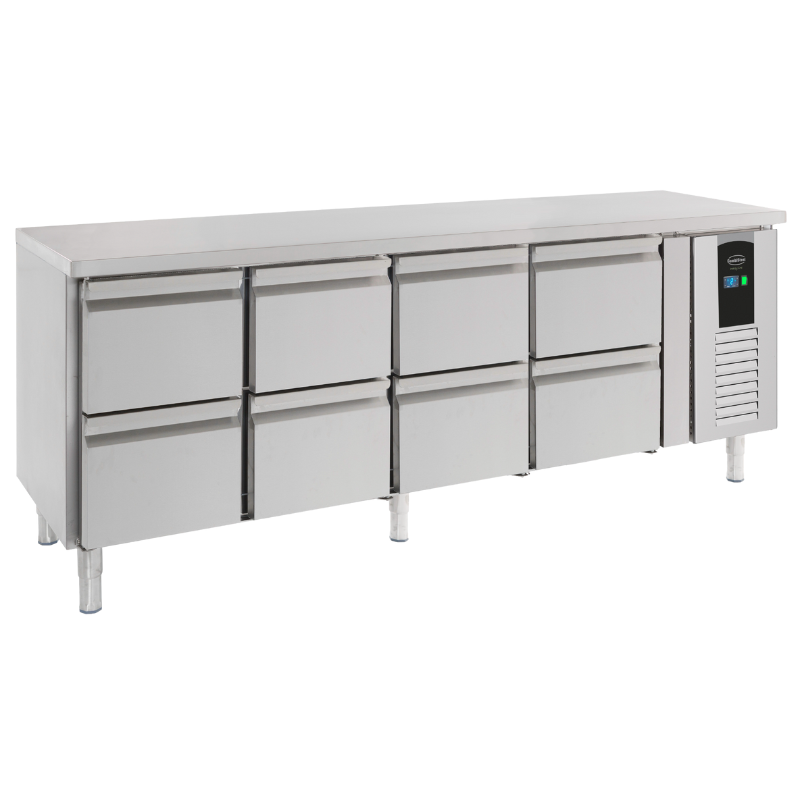 Table réfrigérée professionnelle 4 tiroirs grande capacité. Peut contenir jusqu'à 4 bacs GN 1/1 profondeur 100mm. Compresseur/condenseur gain de place situé dans la partie inférieure. Commande entièrement automatique avec affichage numérique constant. Dégivrage semi-automatique avec intervalle de temps. Sans CFC. Bacs GN vendus séparément.Les meubles réfrigérés Polar Série G sont conçus pour une utilisation commerciale quotidienne dans des environnements professionnels exigeants. Avec une construction commerciale solide et des compresseurs robustes, choisissez la réfrigération de la Série G si vous avez besoin d'un appareil durable que vous avez besoin d'ouvrir fréquemment. La gamme Polar Série G excelle dans des conditions de température ambiante jusqu'à 32 ° C.
