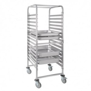 Idealno za profesionalne kuhinje, ovaj vozilo s ladicama GN ima duljinu od 770 mm, dubinu od 585 mm i visinu od 1720 mm. Ima 15 polica dizajniranih za sigurno smještanje gastronorm posuda GN 1/1. Polica se lako čisti toplom sapunicom, a razmak između polica je 80 mm, ali može primiti posude gastronorm bilo koje dubine. Prikladan je za posude GN 1/1, 1/2, 1/3 i 2/3 (maksimalna dubina 65 mm).