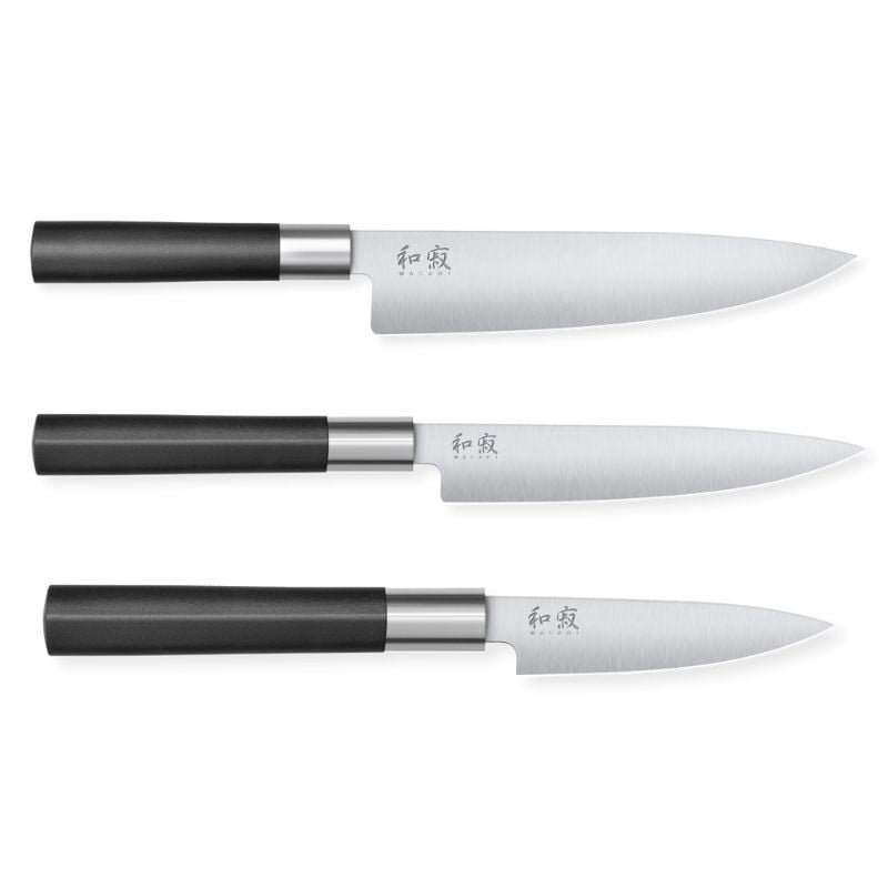 Otkrijte Set od 3 noža Wasabi Black - Univerzalni i Chef marke KAI, neophodan set noževa za profesionalce u kuhinji. Napravljeni od visokokvalitetnih materijala i sa izuzetnom oštricom, ovi noževi će vam omogućiti da lako isečete sve namirnice.