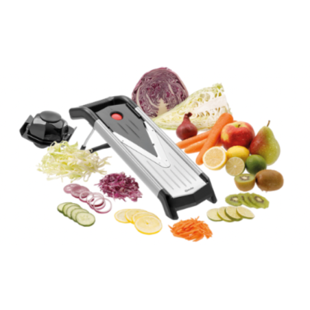 Mandolina ima niz svestranih dodataka: dva dodatka za ribanje i rezanje štapića (3,5 mm i 7 mm) te tri dodatka za rezanje kriški (1,5 mm, 2,5 mm i 3,5 mm), nudeći tako maksimalnu fleksibilnost prema potrebama svakog recepta. Ove opcije omogućuju izvođenje raznih preciznih i ujednačenih rezova, bitnih za prezentaciju i kvalitetu jela.