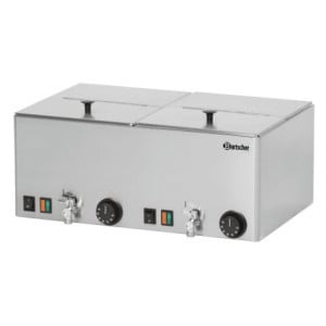 Opremljen dvjema posudama od nehrđajućeg čelika koje se mogu zasebno uključiti, ovaj stroj nudi veliki kapacitet proizvodnje. Dimenzije svake posude su D 240 x Š 300 x V 150 mm, što omogućuje zagrijavanje značajne količine kobasica istovremeno. Zahvaljujući termostatskom podešavanju, temperatura se može prilagoditi od 30 °C do 90 °C, pružajući preciznu kontrolu nad kuhanjem.